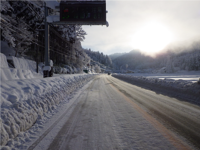 降雪時だけでなく、放射冷却現象により路面が凍結することがあります。